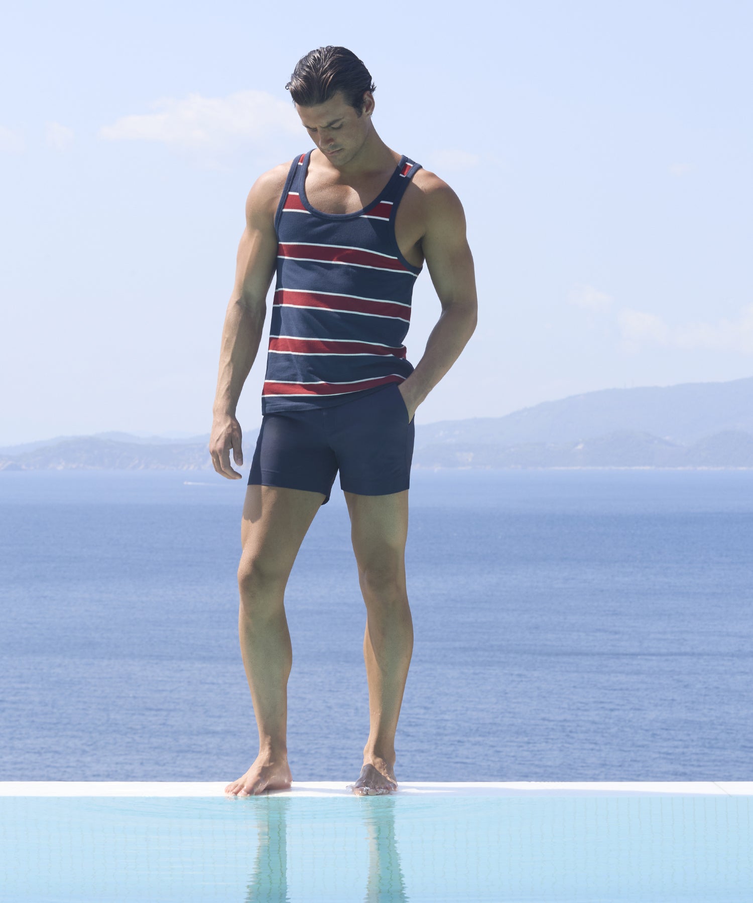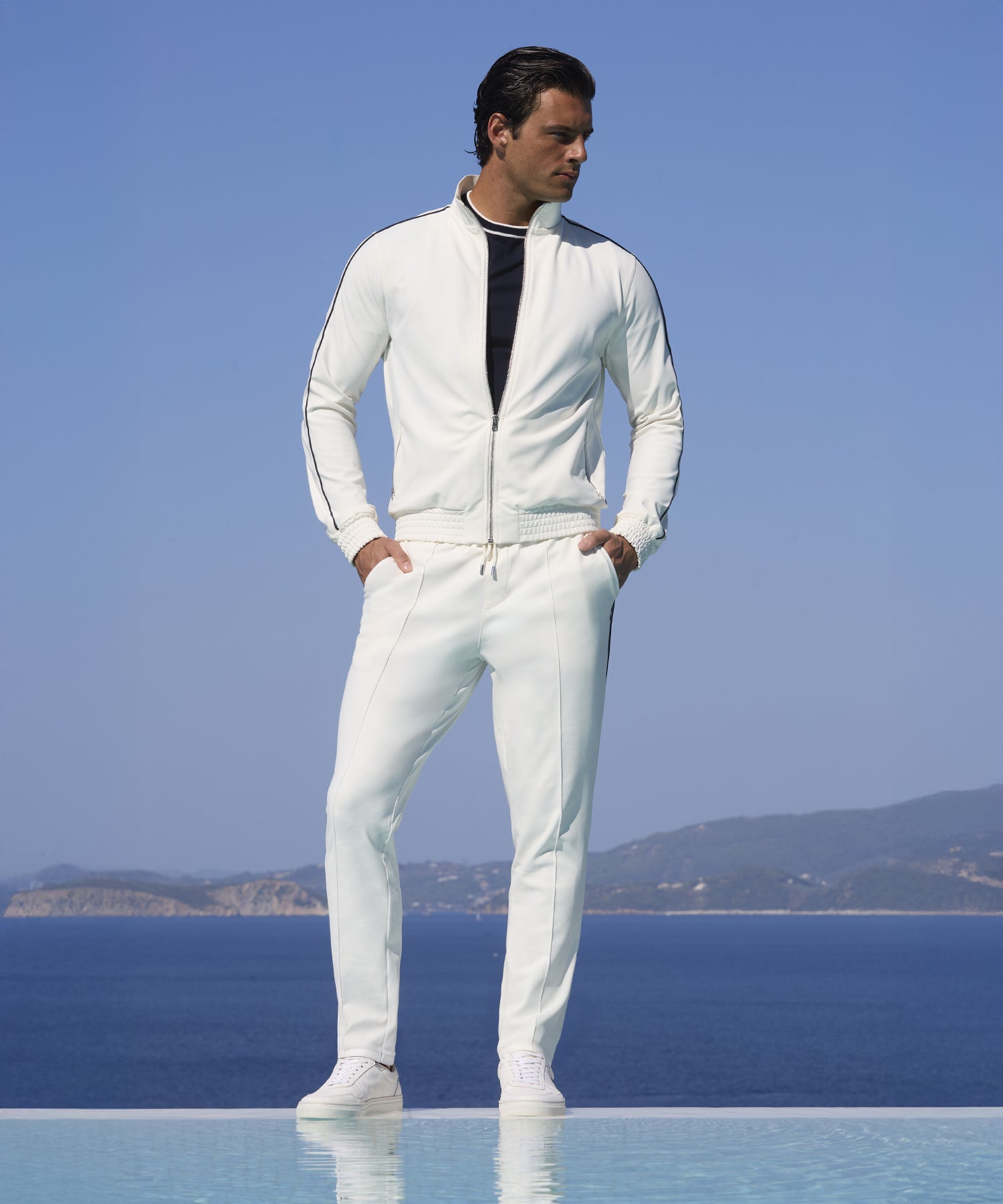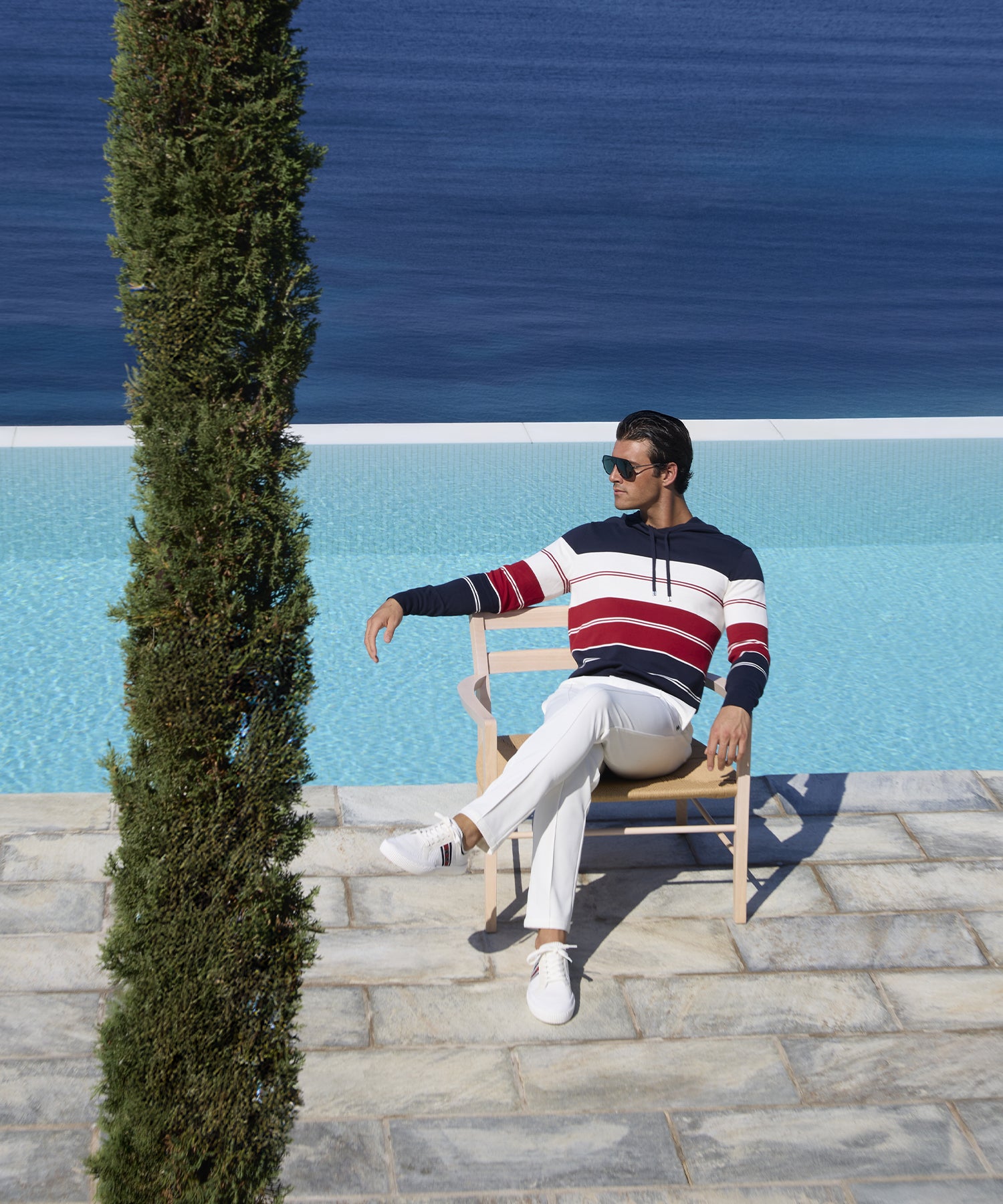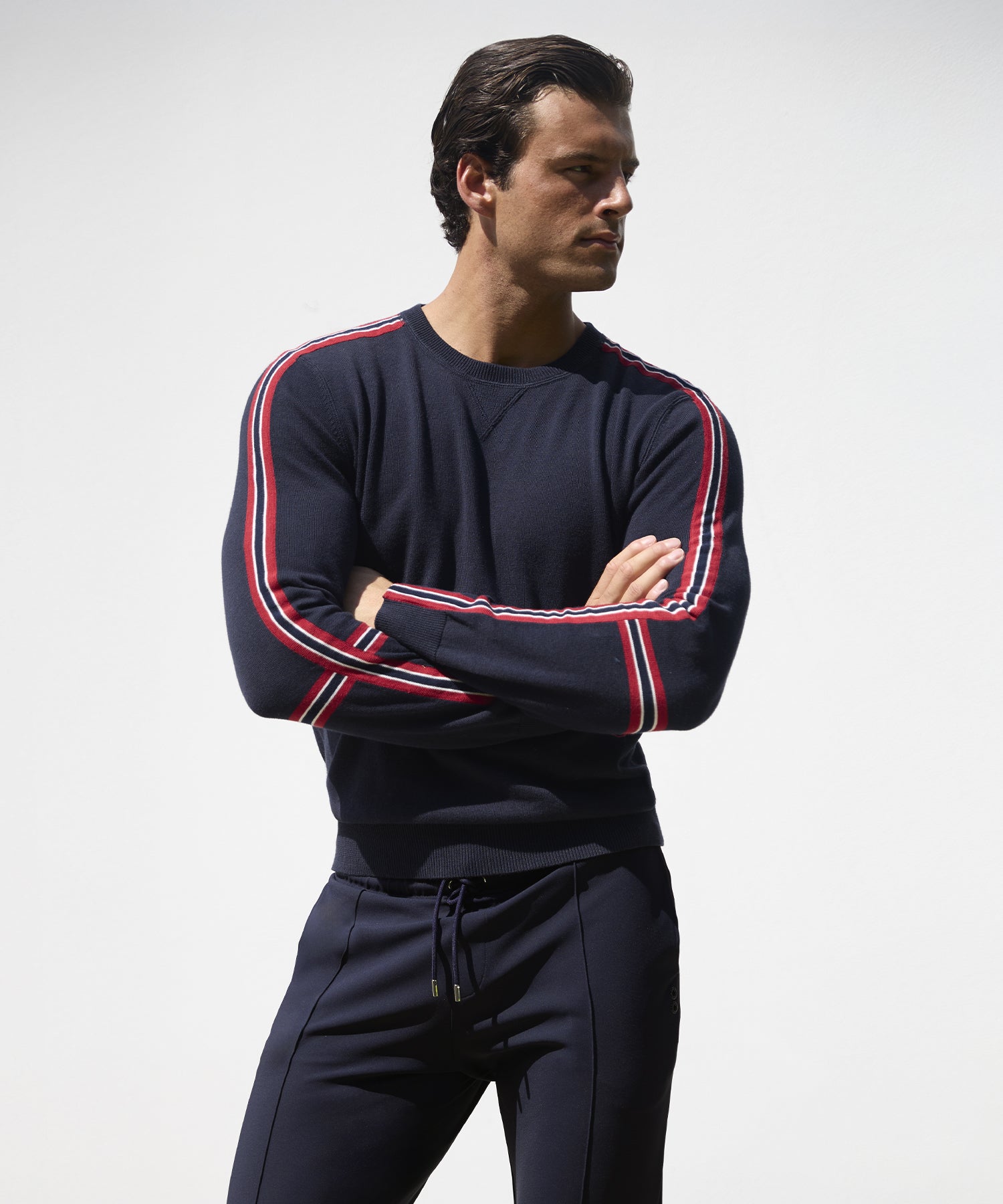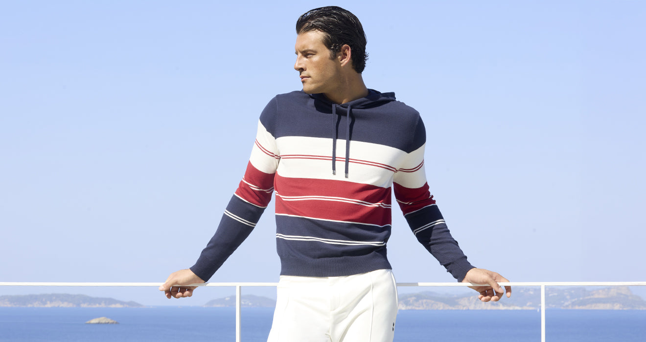 A colourful but refined atmosphere. The look is retro, with deep red, off-white, and navy hues expressed in timeless striped patterns, inspired by vintage beach loungers and parasols. Silhouettes are tailored and clean: city pants and jackets trimmed with contrasting piping to sharpen the line. A sporty elegance, designed for wandering — or performing — along the quiet docks of the off-season Italian Riviera.